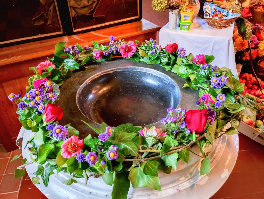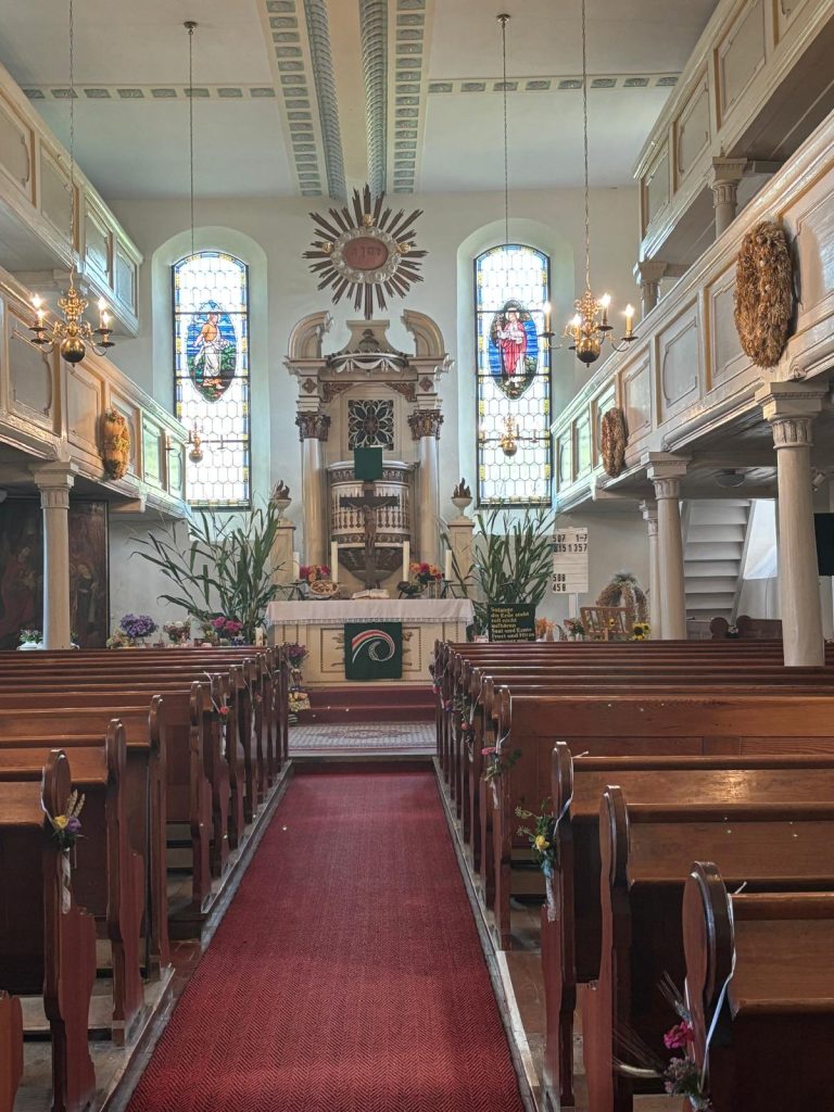 Diesmal begann unser Nachmittag mit einer Kirchenführung in Waldkirchen. Dort wurden wir herzliche von Frau Riedel empfangen, die uns vieles Interessantes über die Kirche zu berichten wusste. Beeindruckt haben uns insbesondere die mächtige Eingangstür und die liebevoll gestalteten Entedankkränze sowie der wunderbar geschmückte Altarraum.